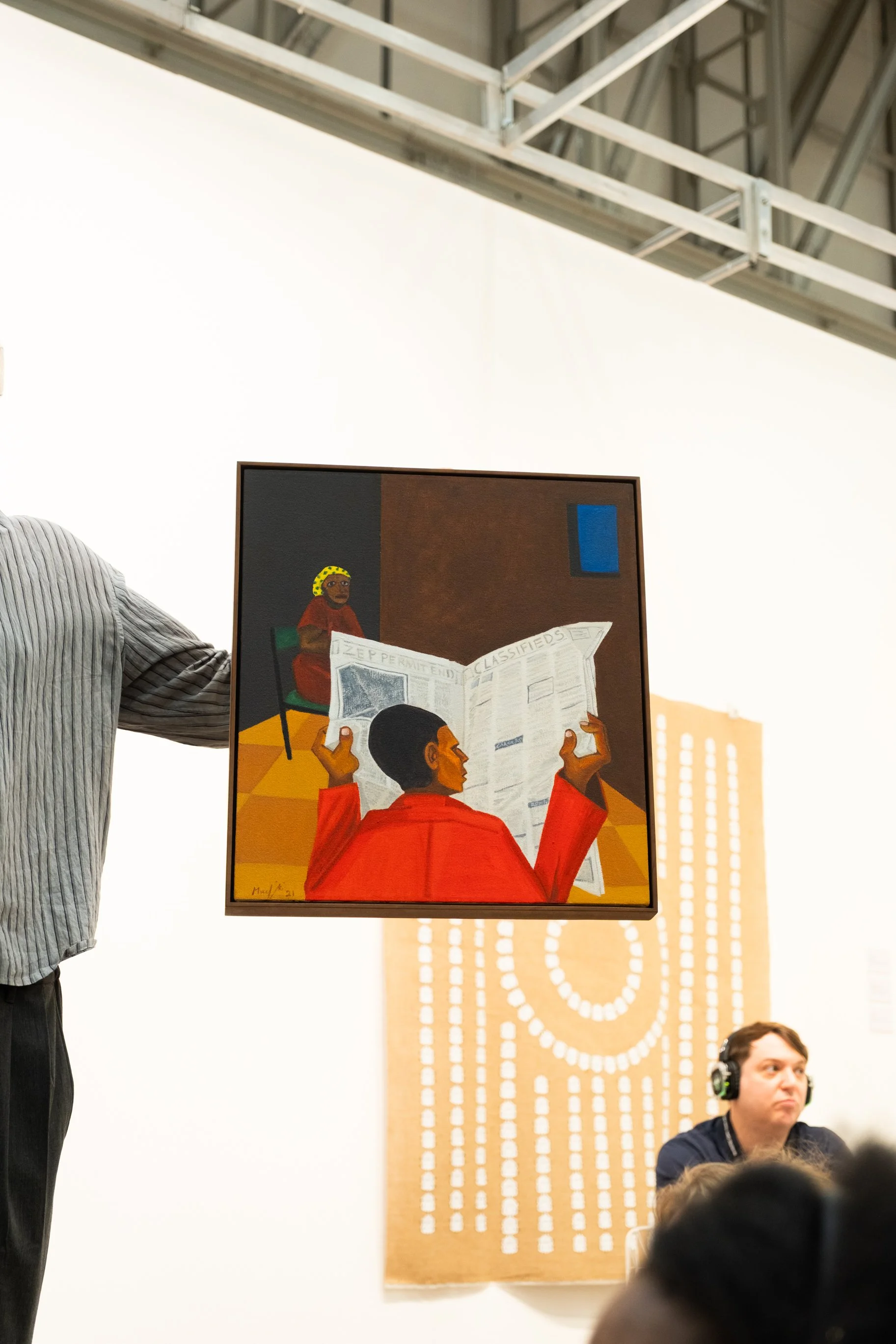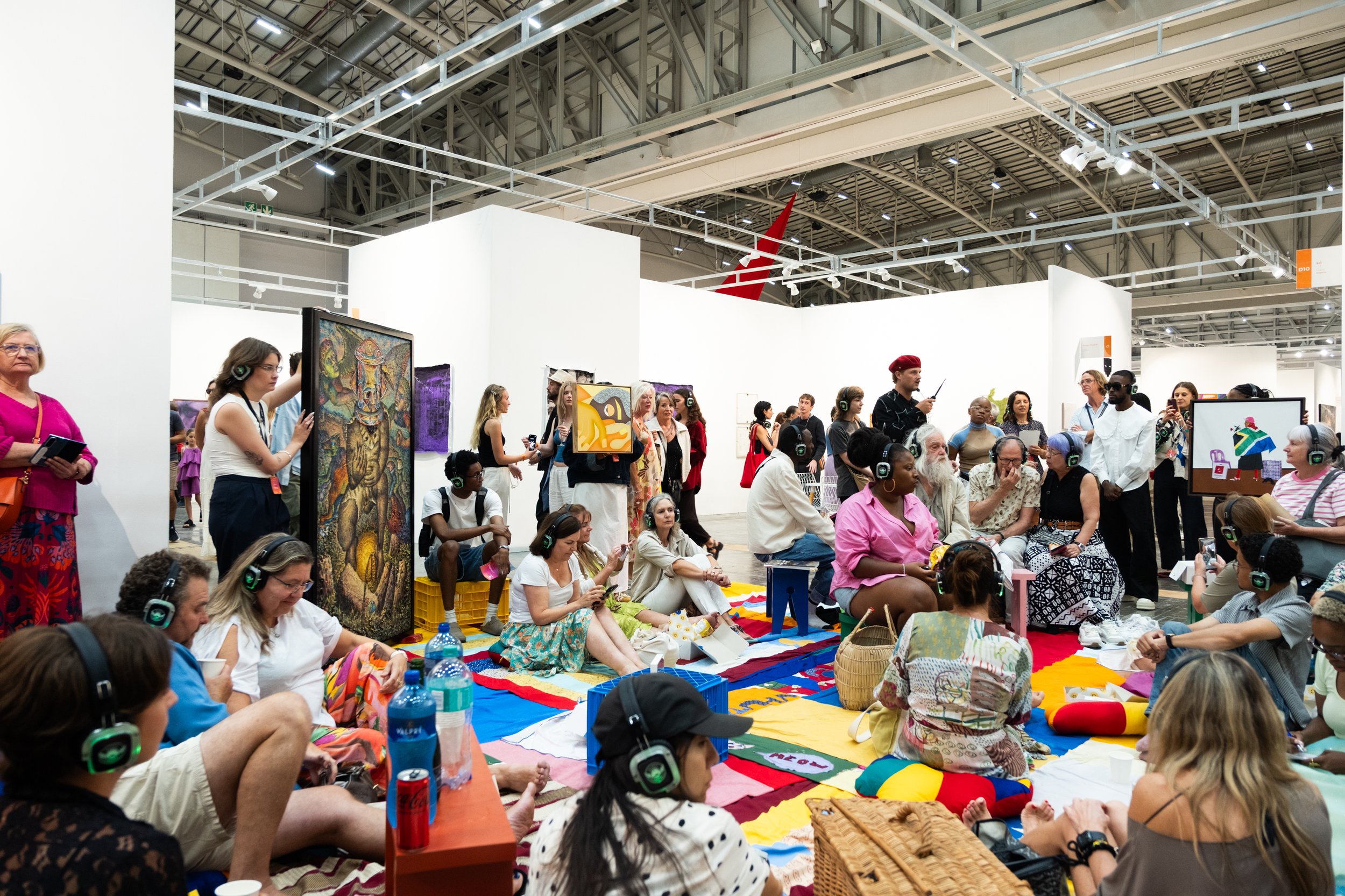 Uncommon within commercial art environments, the posture of picnicking introduces rest, openness, and informality into a context typically defined by movement, productivity, and sales. The simple acts of sitting on the ground, sharing food, and slowing down reposition the art encounter as one rooted in presence and collective experience. In this way, the picnic becomes a deliberate intervention that reclaims humanity and community within a highly commercial setting.